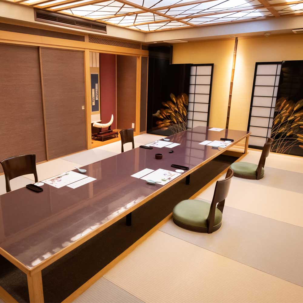 接待や顔合わせに最適なお座敷のプライベートな完全個室。周りを気にせず掘りごたつでゆったり。2名でのお食事から、最大120名までの会食にも対応。完全個室でゆったりとしたプラベート空間でお過ごしいただけます。